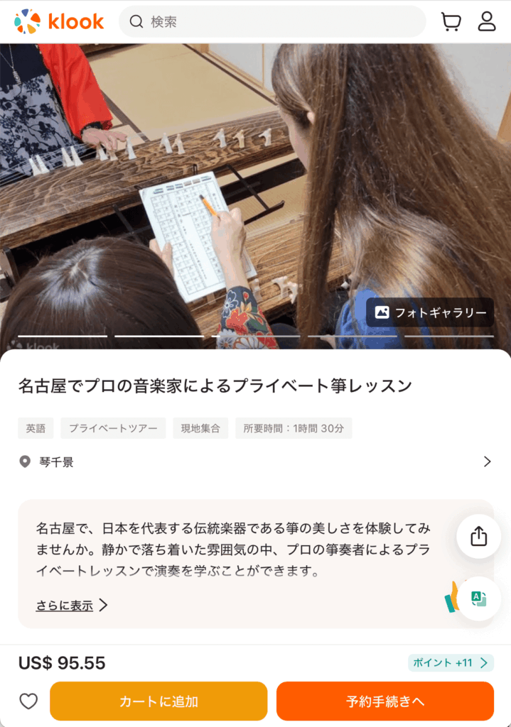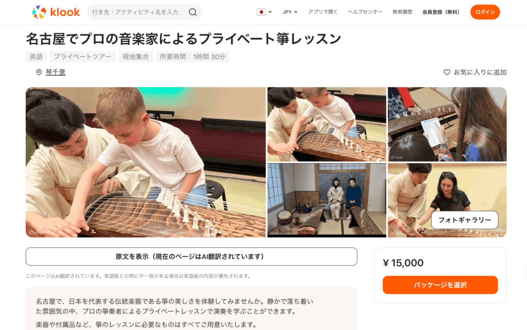 KlookにてPrivate Koto Lessonの掲載がスタートしました 2026年3月5日 最終更新日時 : 2026年3月5日 fl_admin Klookにて、私たちのインバウンド向けプライベート箏レッスンをご紹介いただきました。 レッスンの詳細・お申し込みはこちらからご覧いただけます。https://rieasai.com/ja/6064/ Private Koto Lesson with a Professional Musician in Nagoya Private Koto Lesson with a Professional Musician in Nagoya Experience the beauty of the koto, one of Japan’s most iconic traditional instruments, in Nagoya. En… Rie Asai | 浅井りえ 日本を拠点として活動している箏アーティスト