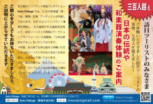 Koto Chikage にて、訪日ツーリスト様向けの日本伝統文化体験教室を開催しております。 この度、訪日ツーリスト様向け「お箏体験」のパフォーマンス鑑賞の一部を動画で公開いたしました。 ぜひ楽しい体験の様子をご覧くだ […]